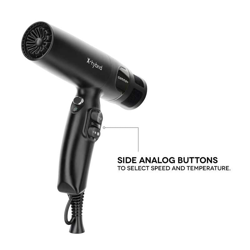 - 2 speeds and 6 temperatures: Hybrid offers a wide range of temperature and speed combinations, allowing you to customise drying according to your needs and preferences. Thanks to the analogue side buttons that simplify selection, you can easily adjust the speed and temperature of the hair dryer for best results.